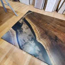 Black metallic epoxy resin river with live edge raw edge walnut slabs. Dark brown beautiful grain walnut on metal legs. Central Alberta custom live edge hardwood epoxy river console tables